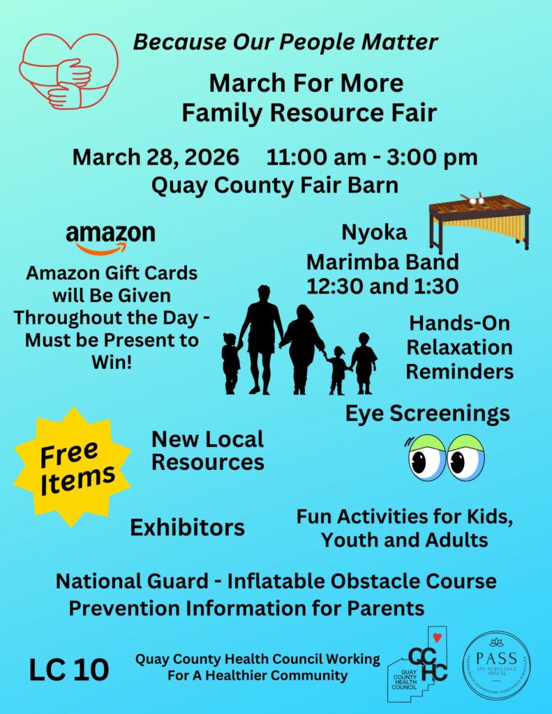 Annual Family Resource Fair and Substance Misuse Awareness Event at the Quay County Fairgrounds. The 2026 Event will be on March 28th from 11:00 to 3:00 pm. The event is Free.